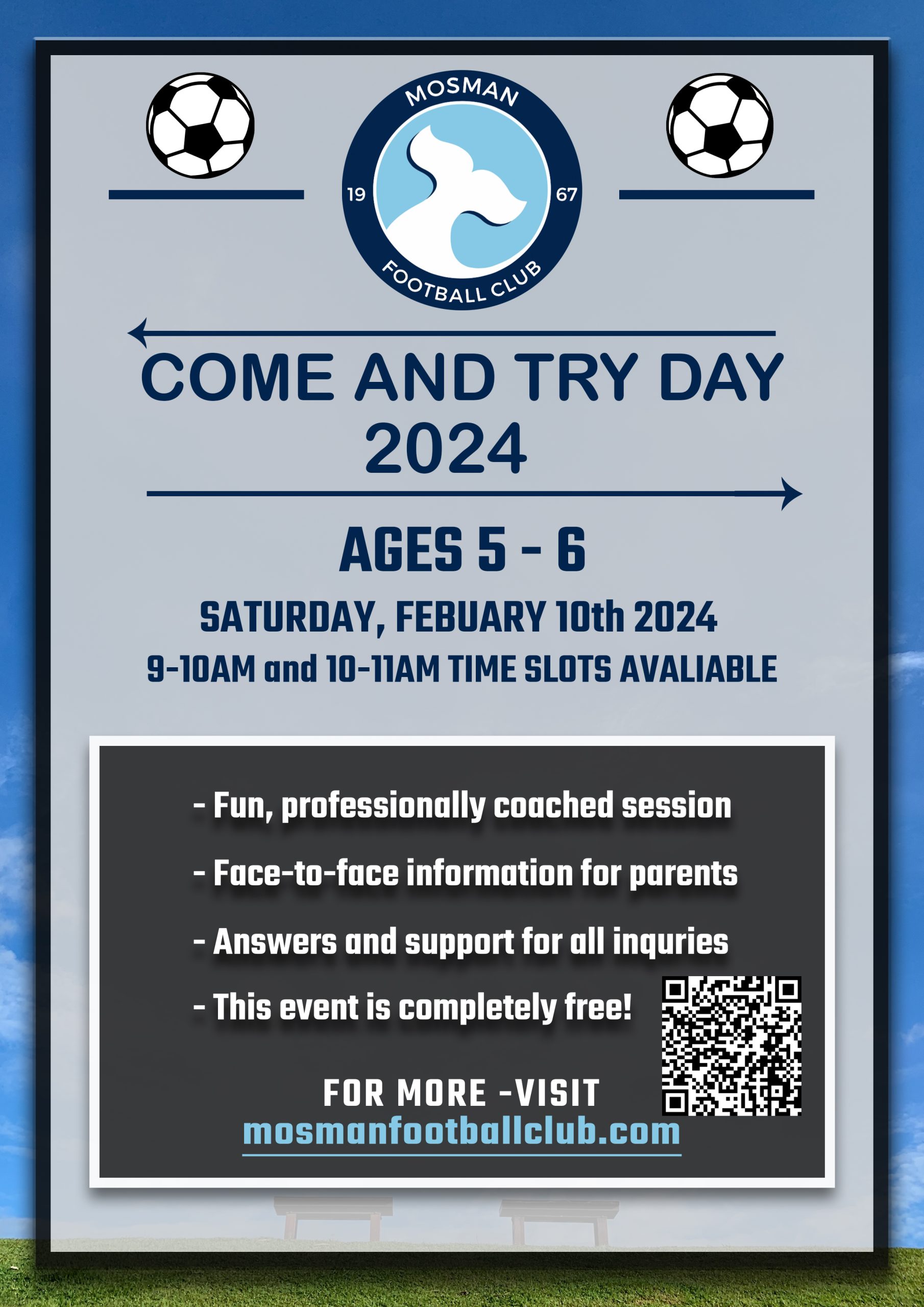 Mosman Football Club is pleased to be hosting a Come and Try Day for 5 and 6 year olds who are contemplating playing football (soccer) in 2024.