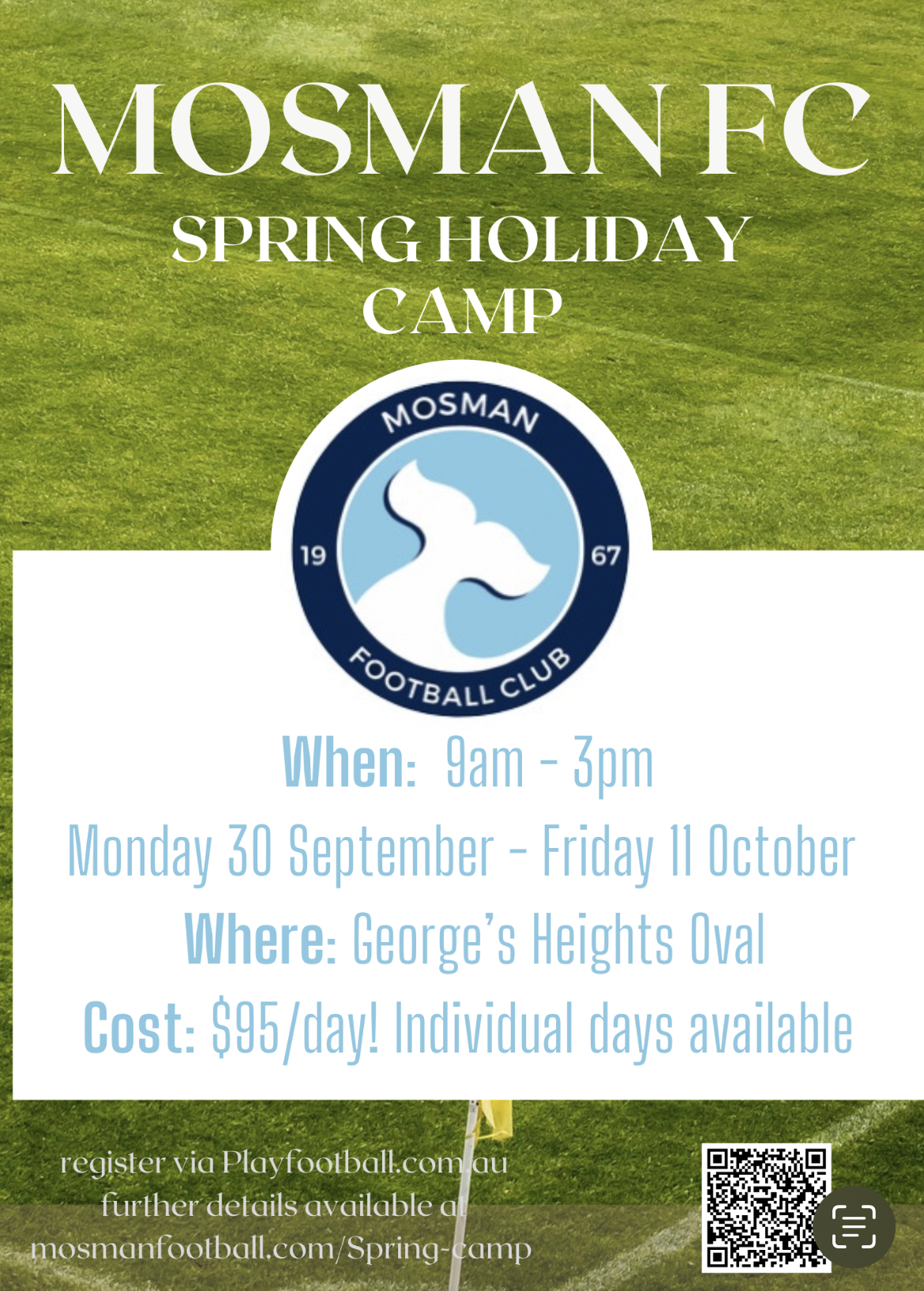 Come and join the club coaches for 2 weeks full of football. Running through the school holidays at Georges Heights Oval, camp offers players the opportunity to develop their skills in a fun environment. 9am to 3pm each day, players can book for single days or for the full two weeks.